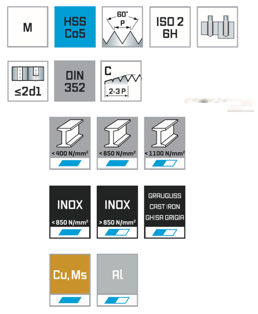 Метчик Maykestag HSS.Для сквозных и глухих отверстий подходит для легированных и нелегированных сталей до 850 Н / мм², литые стали, ковкий чугун, латунь, алюминий и медь.