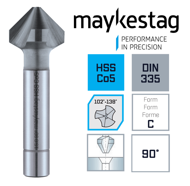 Высокопроизводительный зенкер 90° MAYKESTAG HHS Co5% , с разными углами режущих кромок (102°- 138°) . Область применения: Для черных и цветных металлов синтетические материалы мягкие и твердые. Универсальное удаление заусенцев и всех видов растачивания. Отличная резка и уникальные характеристики гарантируют гладкую поверхность за счет неравномерно разделенными режущими кромками.