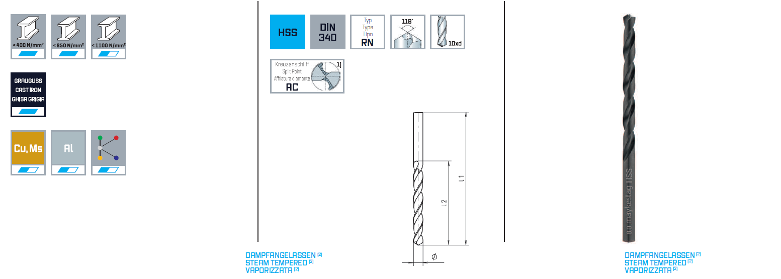Спиральные сверла высшего качества для сверления легированных и нелегированных сталей, стального литья, серого чугуна, ковоного чугуна, медные сплавы, нейзильберовые сплавы, графитовые сплавы и подобные материалы.