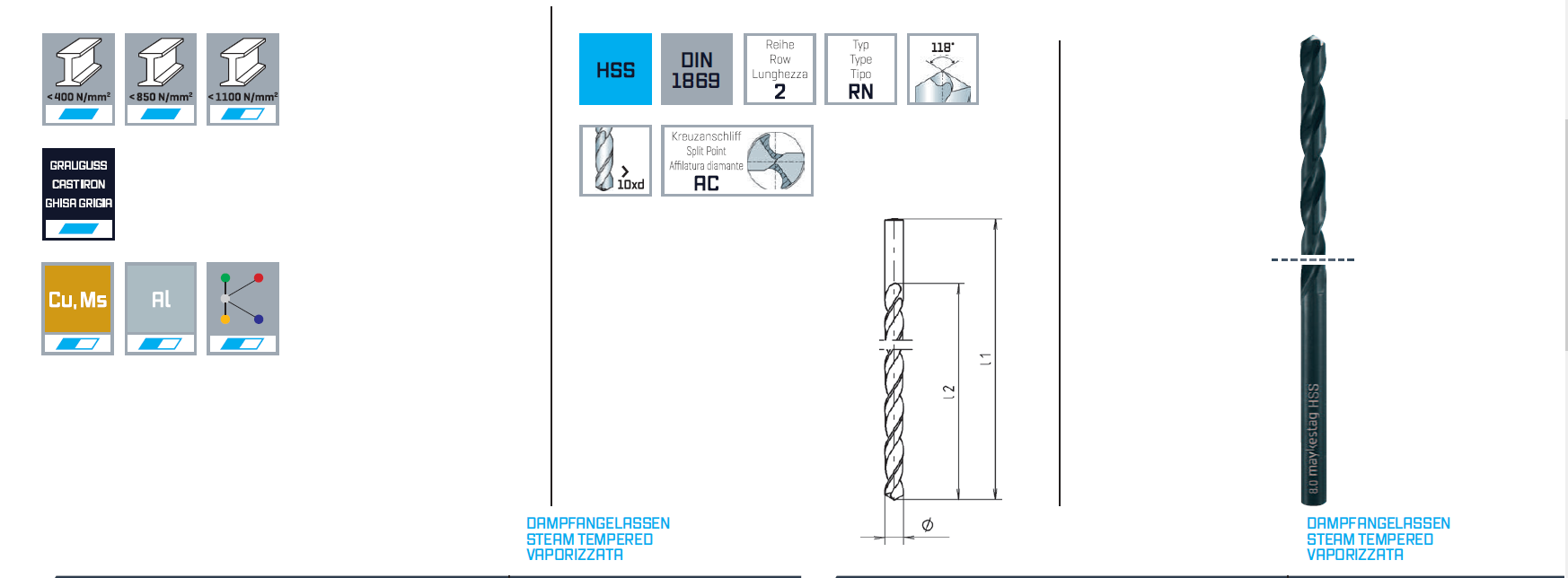 Спиральные сверла высшего качества для сверления легированных и нелегированных сталей, стального литья, серого чугуна, ковоного чугуна, медные сплавы, нейзильберовые сплавы, графитовые сплавы и подобные материалы.