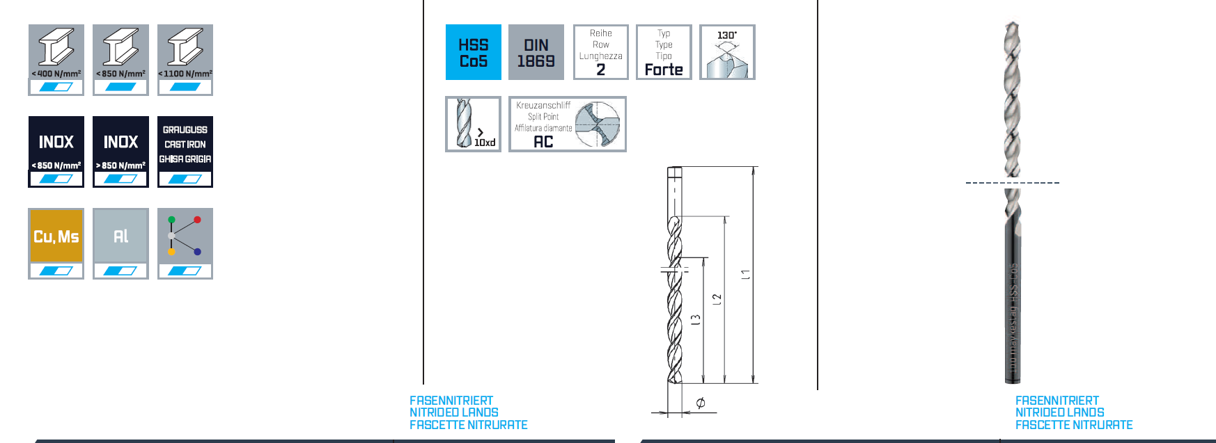 Спиральные сверла высшего качества, усиленное со специальной формой спирали для глубокого для сверления высоколегированных сталей, подшипниковых сталей, горячекатаные и холоднокатаные стали, стального литья, серого чугуна, кованого чугуна, медные сплавы, нейзильберовые сплавы, графитовые сплавы и подобные материалы.сверления