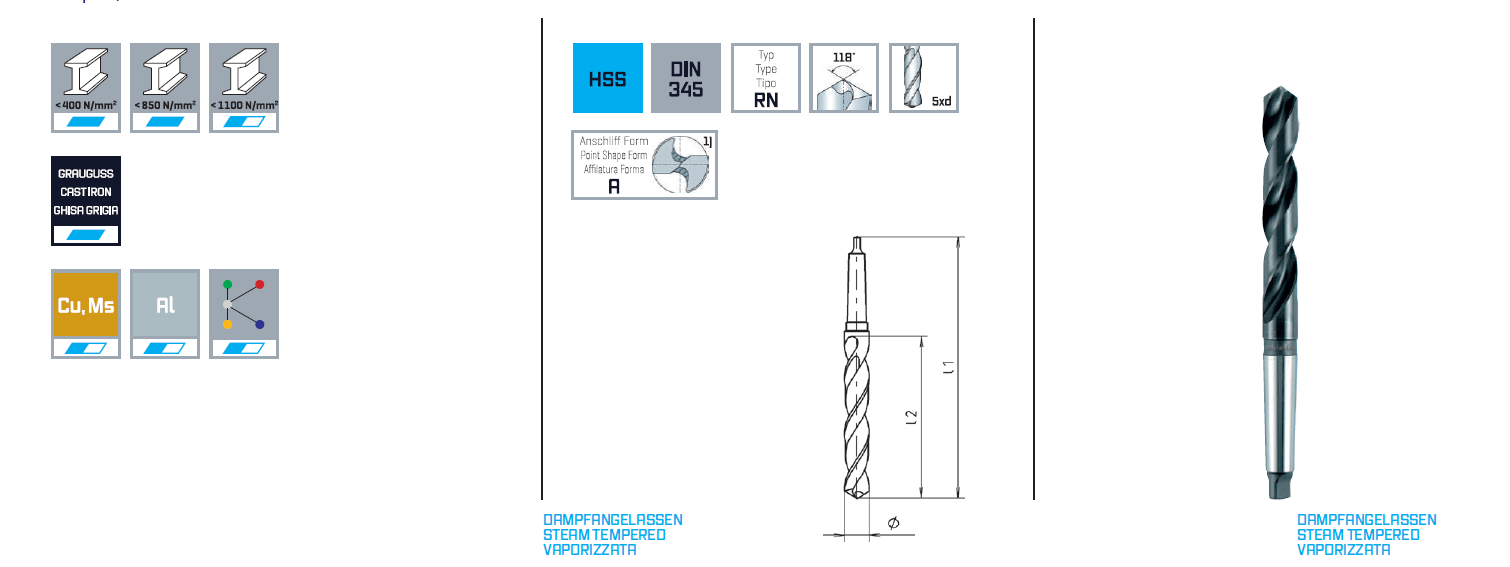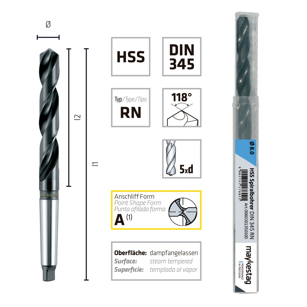 Сверла с конусом морзе DIN 345 из быстрорежущей стали MAYKESTAG , выпускаются исключительно в Австрии, что гарантирует полный контроль за качеством, самый современный уровень техники и максимальную точность.