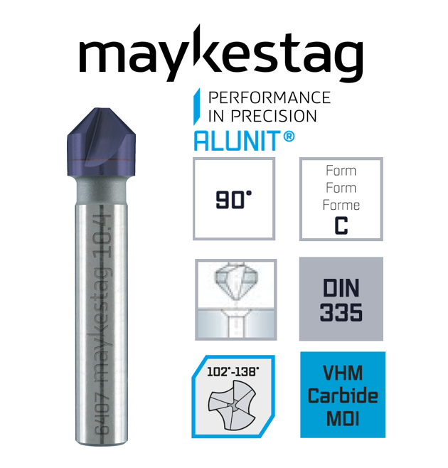 Высокопроизводительный твердосплавный зенкер MAYKESTAG c покрытием ALUNIT , с разными углами режущих кромок (102°- 138°) . Область применения: Для черных и цветных металлов синтетические материалы мягкие и твердые. Универсальное удаление заусенцев и всех видов растачивания. Отличная резка и уникальные характеристики гарантируют гладкую поверхность за счет неравномерно разделенными режущими кромками.