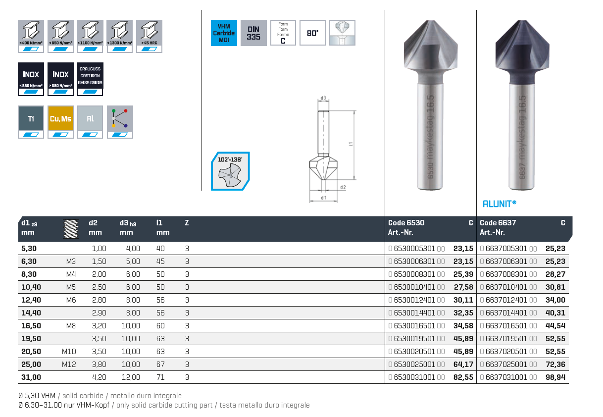 SC-countersink 90°,DIN 335, Shape C, different partition, ALUNIT