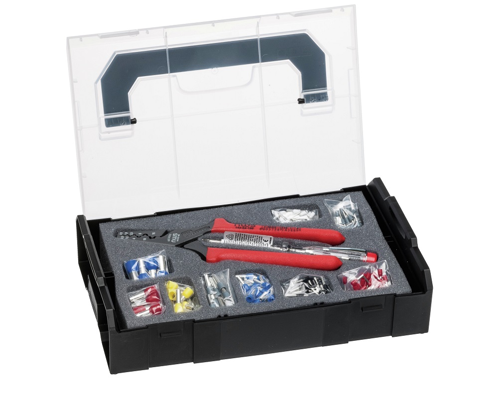 Комплектуется клещами для опрессовки и примерно 110 изолированными кабельными зажимами в ассортименте, от 0,5 до 16,0 мм².