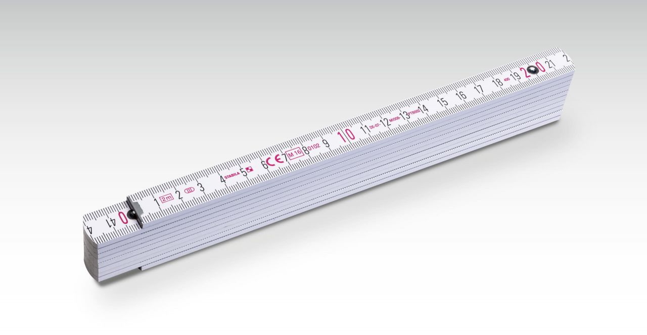 Двусторонняя шкала с делением в сантиметрах и миллиметрах по обеим кромкам складного метра.