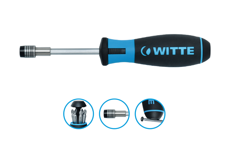 С WITTE PRO BITDRIVE® у вас действительно все под рукой. Помимо эргономичной рукоятки, которая позволяет передавать еще более высокие крутящие моменты, новый PRO BITDRIVE® включает в себя магазин с шестью битами на конце рукоятки. Вся конструкция выполнена в проверенном дизайне WITTE PRO. Эргономичное управление может быть таким удобным.